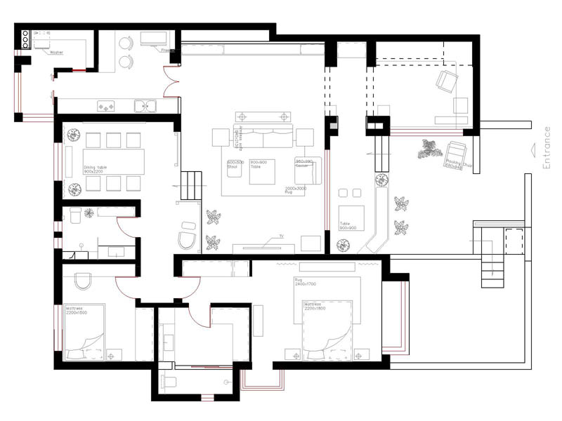 這是最終的平面布置圖,沙發(fā)還是正對(duì)進(jìn)門的這么墻舒適一些!主衛(wèi)干濕分離,在保留主衛(wèi)的前提下,洗手臺(tái)和衣帽間共處一個(gè)空間;休閑區(qū)域的窗戶改成大面積落地窗,窗下可以擺放一把搖椅或舒適的休閑椅子,在這里可以呵呵咖啡,曬曬太陽(yáng),欣賞庭院滿眼的綠色!
