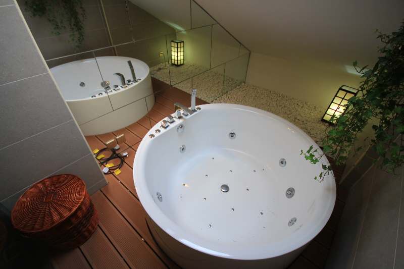 雖然是個(gè)坡屋頂,但絲毫不覺(jué)得有壓迫感,鏡面把空間放大了一倍!在最低處我設(shè)計(jì)了白色的沙石,生態(tài)木地板搭配白色圓形浴缸還有藤編收納筐,綠色盆栽,營(yíng)造了一種休閑放松,自然的氛圍!