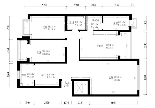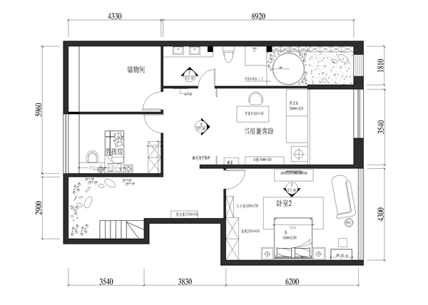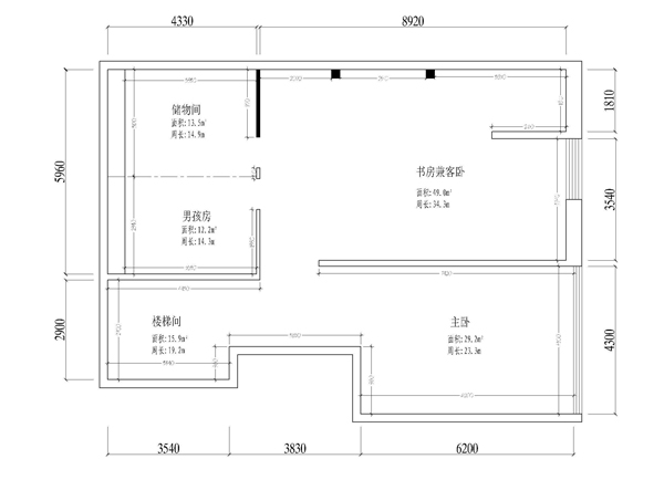二層原始平面結(jié)構(gòu)圖,原有三個(gè)空間,其中一個(gè)是敞開(kāi)的大空間,我將它一分為二,設(shè)計(jì)為洗手間及書(shū)房