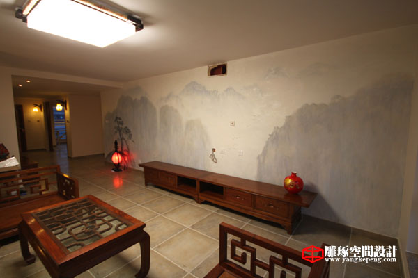 后又根據(jù)實(shí)際比例尺寸,加工重新設(shè)計(jì)構(gòu)圖,用油畫(huà)顏料表達(dá)水墨山水的意境,難為這位畫(huà)師了,這位畫(huà)師人很謙和,四十歲左右,行家有沒(méi)有,從他拿起畫(huà)筆開(kāi)始第一筆的時(shí)候,我就知道這位畫(huà)師請(qǐng)對(duì)了!我想要達(dá)到一種朦朧,好似云霧繚繞的效果,對(duì)于我們同樣都是學(xué)過(guò)藝術(shù)的就很好溝通,最后完成的效果還不錯(cuò)!我跟客戶(hù)朋友開(kāi)玩笑說(shuō):你以后每天都可以坐在云端,天人合一,俯瞰眾生,過(guò)著逍遙自在神仙般的生活!呵呵!
