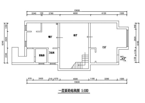 一層原始平面結(jié)構(gòu)圖,注意門廳有儲(chǔ)藏間,客廳由于有臺(tái)階空間小且家具電視不好擺放,餐廳和客廳之間還有臺(tái)階,再加上頂面有中央空調(diào)管道,整個(gè)空間高度明顯很低,具體解決辦法見后圖。