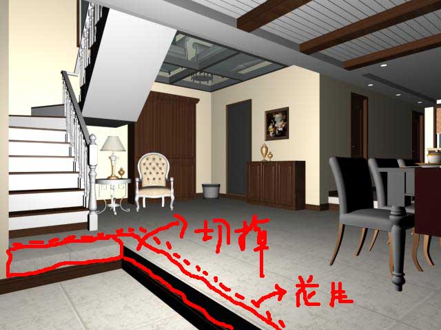 15.一層第一踏步下方的踢腳去掉,也鑲貼小花磚