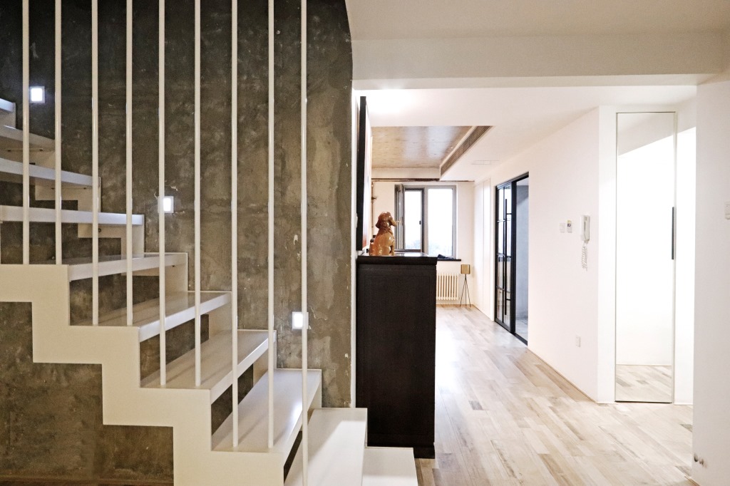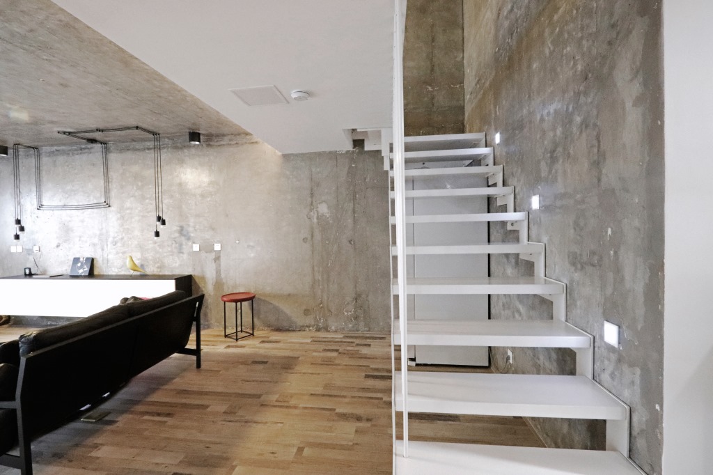 客廳一整面墻裸露混凝土,一直延伸至二層;樓梯的設(shè)計(jì)猶如律動(dòng)的五線譜;