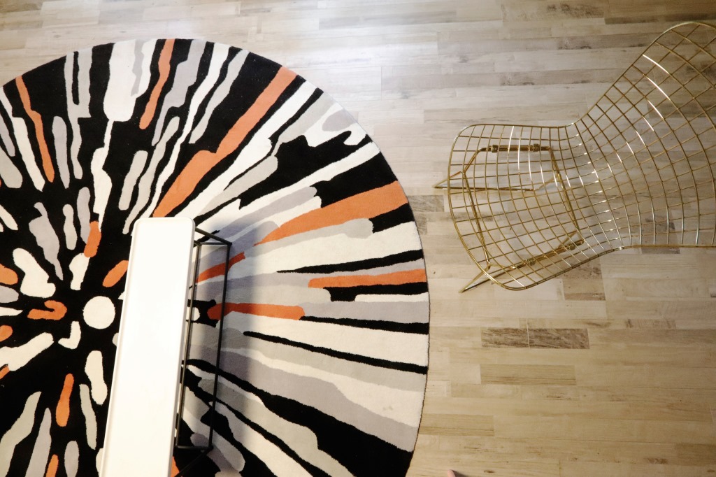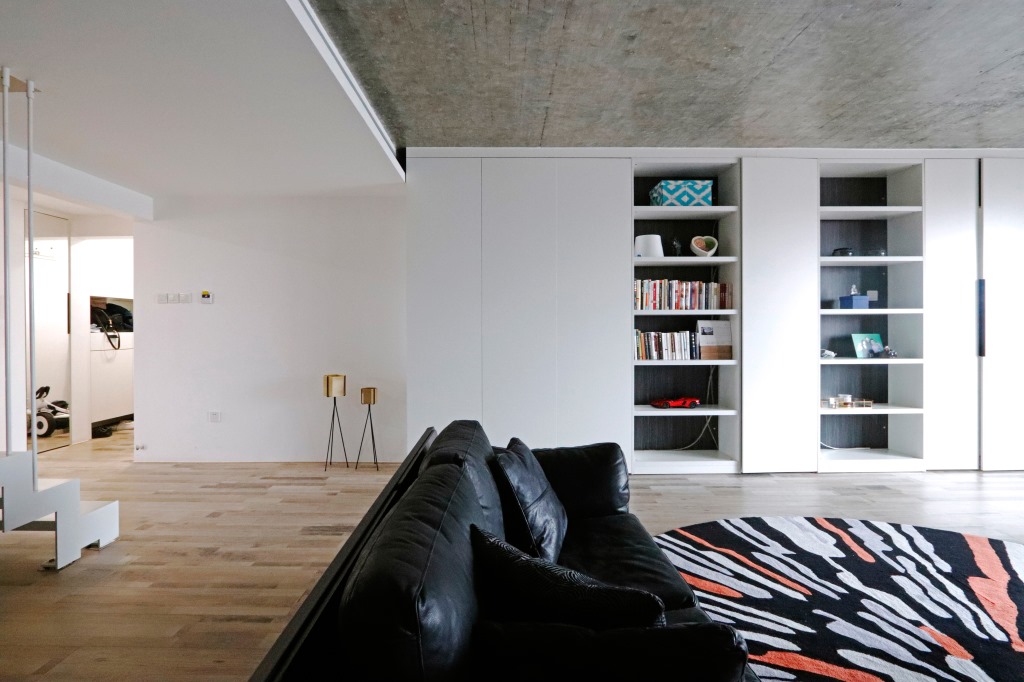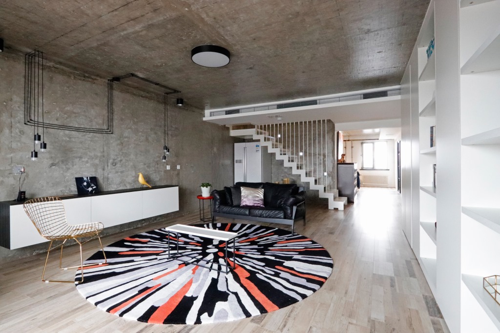 頂面裸露混凝土,大面積的收納柜解決了屋主的收納及展示需求,另外隱形門的設(shè)計(jì)將主臥的隱藏了起來(lái),黑白灰色調(diào)強(qiáng)烈對(duì)比,加上暖色圓形地毯給空間增加了幾分暖意,“高而不冷”!