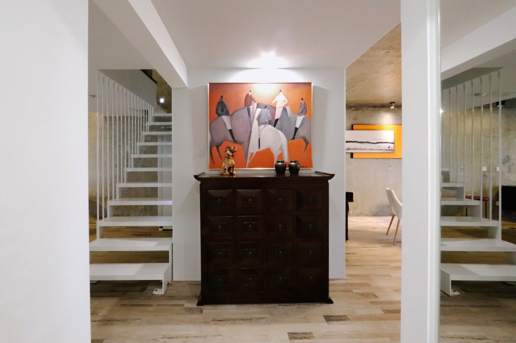 每個(gè)人都會(huì)有一個(gè)對(duì)于“家”的感覺,本次設(shè)計(jì)的主題是打造一處“美術(shù)館之家”,是一所復(fù)式空間的舊房改造設(shè)計(jì),灰白色硬裝打底,營(yíng)造出安靜清爽的基調(diào),黑白色線條增加了空間的精致感;局部點(diǎn)綴的橙色,跳躍在空中,具有很強(qiáng)的視覺張力。