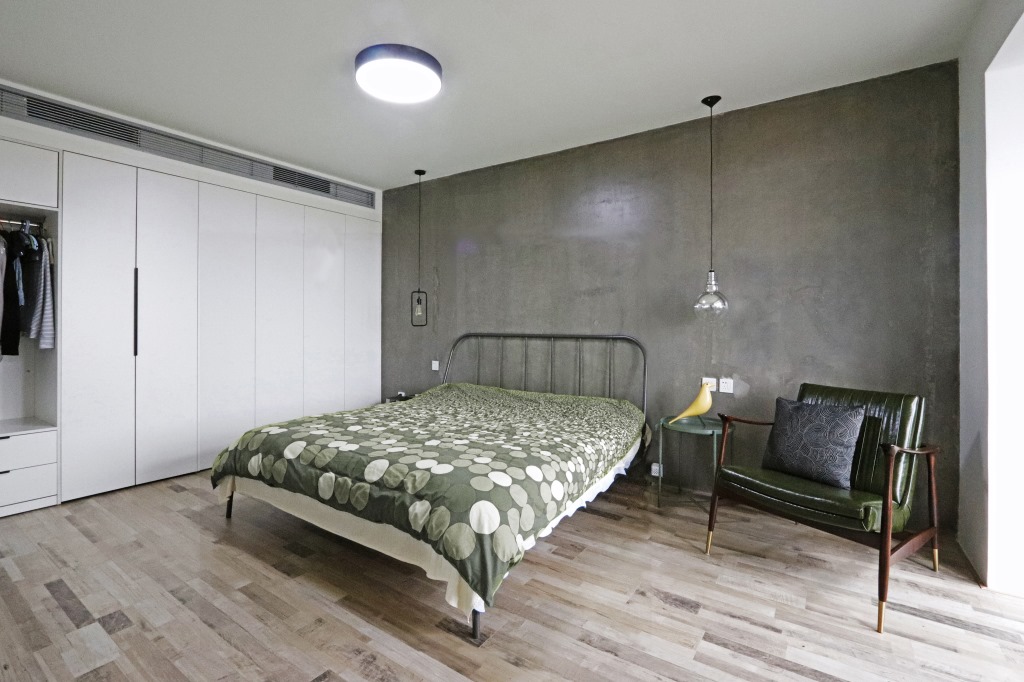 在設(shè)計(jì)之初,女主人就發(fā)我一張混凝土墻面的臥室圖片,明確傳達(dá)了她超級(jí)喜歡混凝土的味道,還有冷淡風(fēng)的感覺,但是男主人對(duì)混凝土不是特別能接受,但不反對(duì),于是我們?cè)俜磸?fù)的溝通后,確定的混凝土在整個(gè)空間總的比例,于是有了這套設(shè)計(jì)作品;