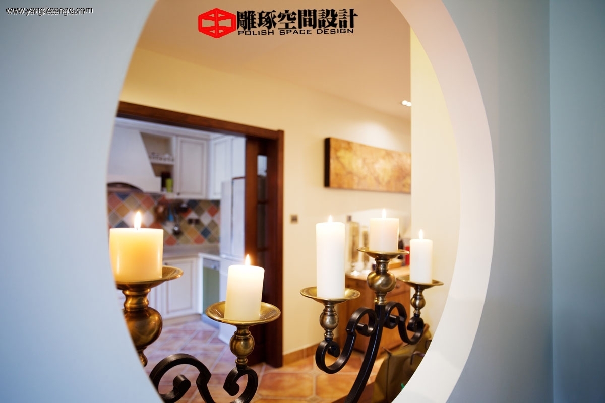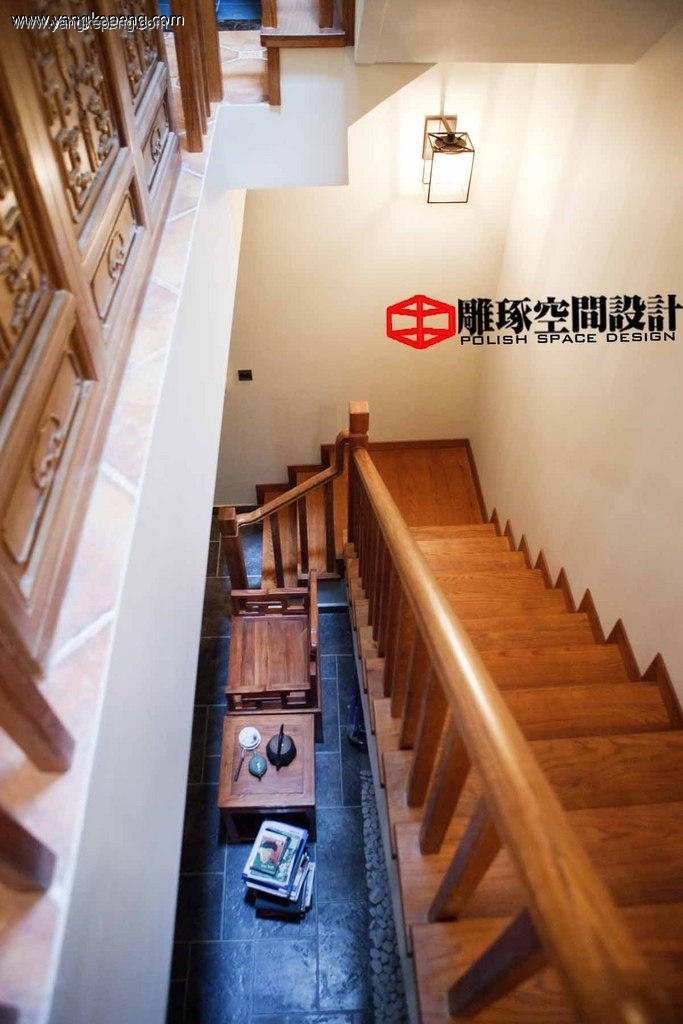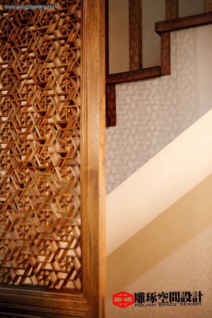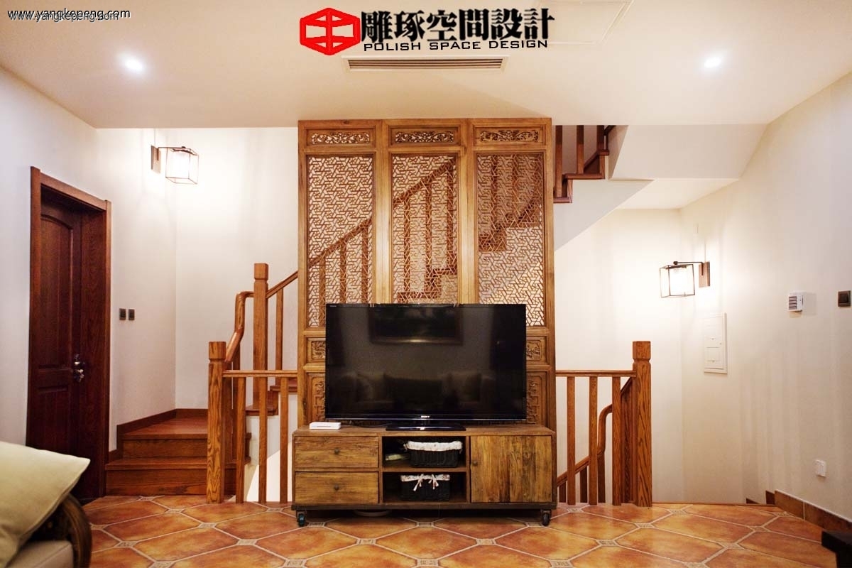 別墅結(jié)構(gòu)是按照西方的生活習慣來設計的,孰不知這種設計很不適合中國人的生活習慣,比如原始電視線路是在樓梯正對的這面墻上,按照西方的家具擺放則是背后是樓梯,按照中國人的習慣進門直沖沙發(fā)心里是很不舒服的;于是我把原有家具和電視的擺放對調(diào),電視后面用雙面雕花的門扇來分割空間,這樣問題就解決了,而且空間視覺不但沒有阻隔感,還給空間增加了一道美麗的風景,每當夕陽下的時候,夕陽透過雕花,將圖案投