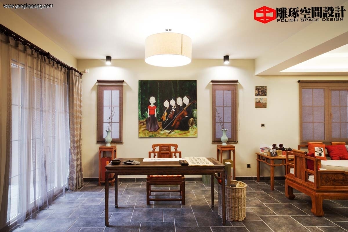地下一層既是主人的家庭工作室,也是主人接待好友,品嘗茗茶的空間,雖然這個空間東方氣韻渲染的比較濃重,但從一層來到這個空間卻絲毫沒有覺得不舒服,因為在設計時早已在其他空間做好了鋪墊和銜接;